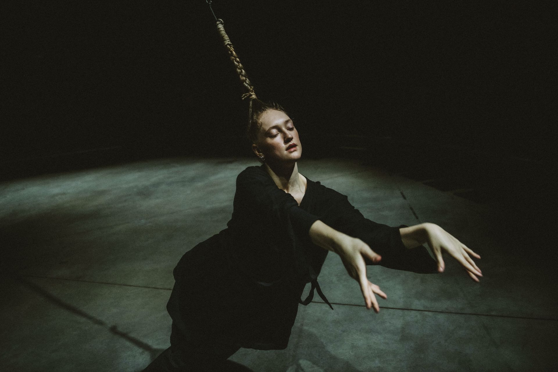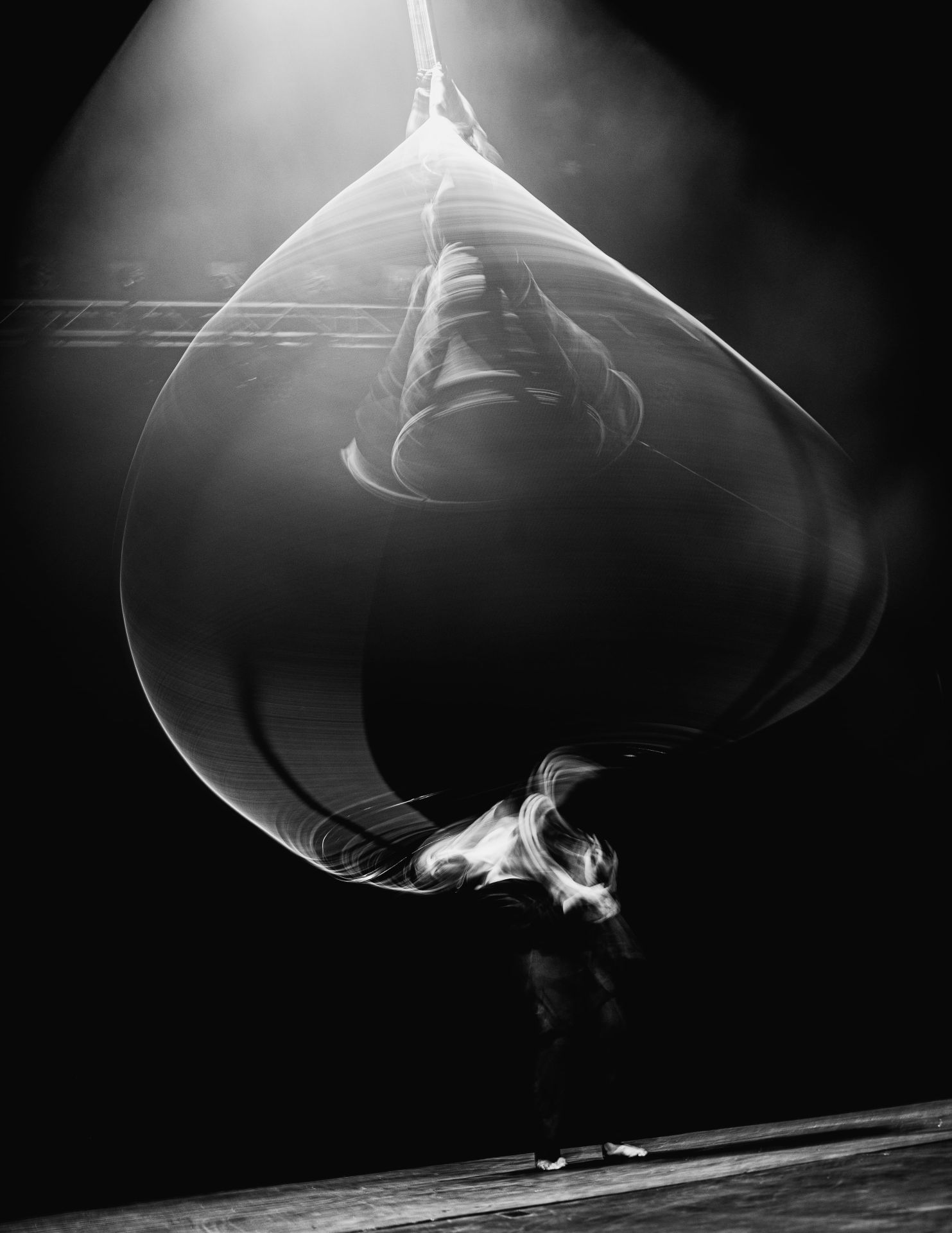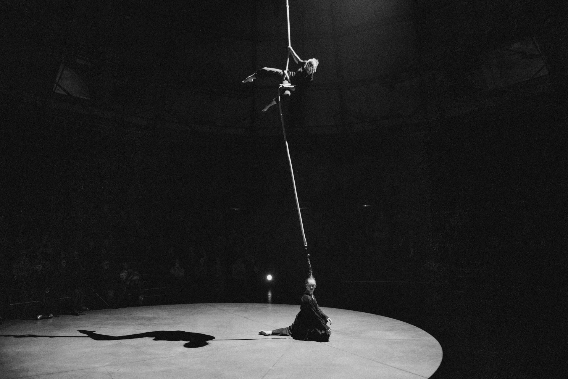 A dancer, an aerial acrobat, a dramaturg, and a rope come together in a shared exploration of rotation, bringing together the disciplines of dance, aerial acrobatics, and hair hanging. Everyone here is connected and interlinked, influencing one another. Two must become one. How a Spiral Works (Spirāle) is an invitation to slow down. The meditative nature of the performance challenges the constant rush of everyday life.