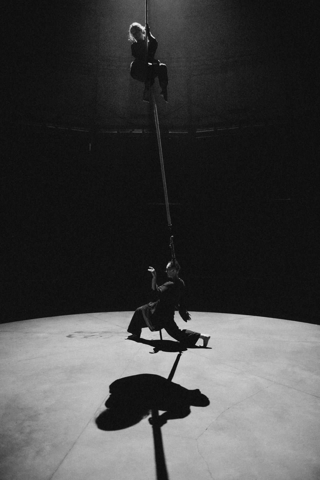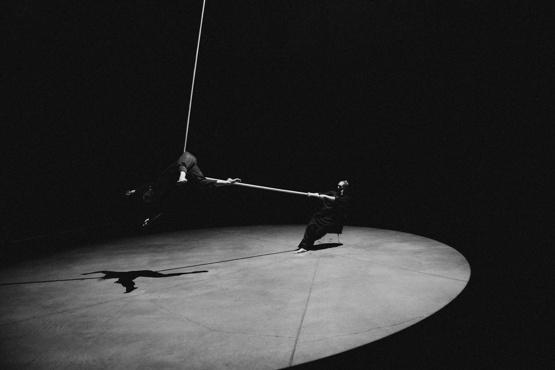 The performance explores the relationship between falling, flying, and catching oneself. It searches for connecting bonds between earth and air. Each longs to find a meeting point, yet this is difficult when existing in different spaces. Two broken pieces together form one whole. Each tries to overcome their individual obstacles while helping the other reach a point of stillness. The performance is an attempt to find new ways of presenting contemporary circus by moving beyond its boundaries and connecting it with dance, digital art, and more. It is a search for new perspectives and innovative applications, while preserving beauty in simplicity.