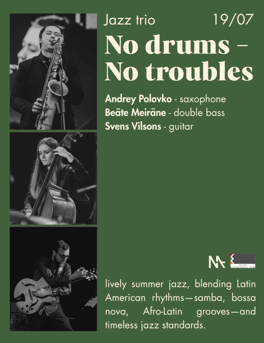 On July 19, MASA Kultūrbārs will fill with lively summer jazz, blending Latin American rhythms—samba, bossa nova, Afro-Latin grooves—and timeless jazz standards.