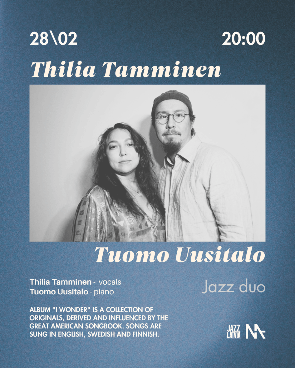 On February 28, MASA jazz club hosts pianist Tuomo Uusitalo and singer Thilia Tamminen with their newly released album 'I Wonder' – a collection of originals, derived and influenced by the Great American Songbook and sung in three different languages: English, Swedish and Finnish.