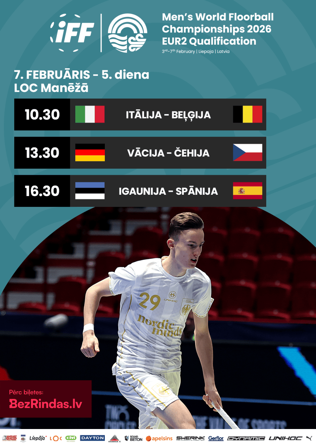 Men's World Floorball Championships 2026 Qualification Tournament will take place at the Liepāja Olympic Center Manege from February 3 to February 7. Six national teams will compete for three tickets to the final tournament in Tampere, Finland.