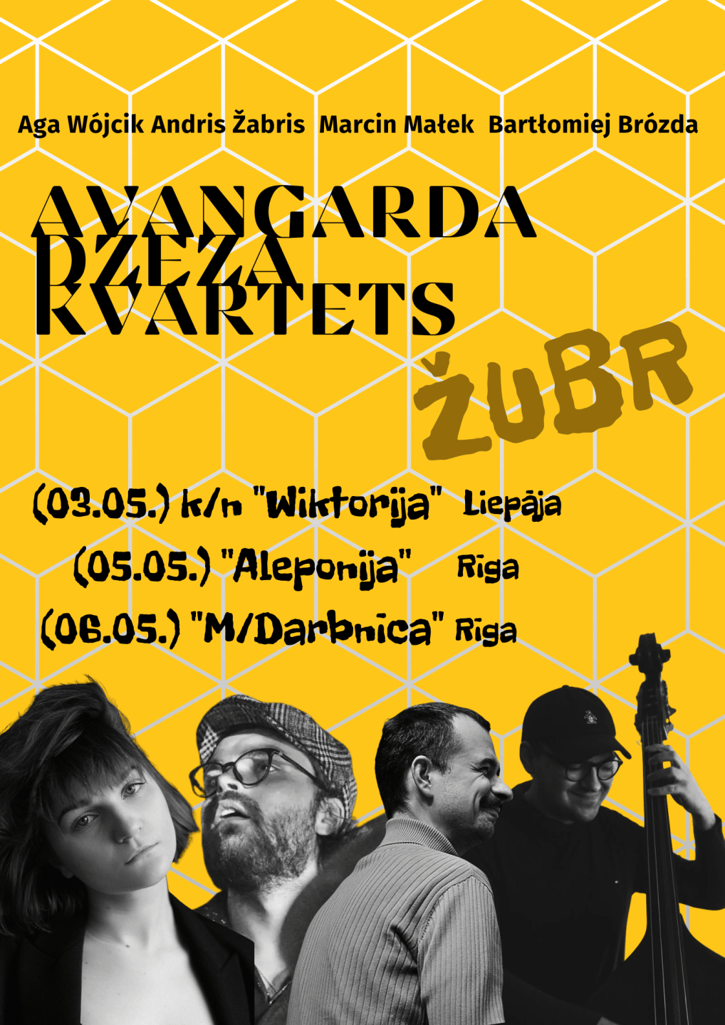 Četri spilgti jaunās paaudzes improvizētās un eksperimentālās mūzikas mākslinieki no Latvijas un Polijas apvienojušies jaunā projektā, avangarda džeza kvartetā “žubr”. Ansamblis apvieno vokālu, kontrabasu, sitaminstrumentus un klavieres, radot daudzslāņainu un neparedzamu skaņas telpu, kur kompozīcija saplūst ar brīvo improvizāciju. Kvarteta sastāvā darbojas poļu vokāliste un komponiste Aga Vojcika (Aga Wójcik), kontrabasists un komponists Bartolomejs Brožda (Bartłomiej Brózda), pianists Marsins Maleks (Marcin Małek), kā arī latviešu bundzinieks Andris Žabris. Katrs no mūziķiem aktīvi darbojas starptautiskajā džeza un eksperimentālās mūzikas vidē, piedaloties dažādos projektos un ansambļos Eiropā. Projekta ideja radās Oslo, kur mūziķi pirmo reizi satikās un atklāja kopīgu muzikālo valodu, kas balstīta uzticībā, klausīšanās kultūrā un spontānā radošumā. Šis projekts iezīmē jaunu starptautisku sadarbību, piedāvājot svaigu, eksperimentālu un laikmetīgu skanējumu. Projektā “žubr” mākslinieki pievēršas pilnīgi jaunam repertuāram, kas radīts tieši šim sastāvam. Mūzikā savijas ēteriskas vokālās līnijas, paplašinātas instrumentu tehnikas un brīva, intensīva mijiedarbība, ievedot klausītāju dziļi mūzikā, dāvājot nebijušu pieredzi. Kvarteta skanējumu raksturo drosmīga žanru robežu nojaukšana – no laikmetīgās improvizācijas līdz modernajam džezam. “žubr” koncerti paredzēti Latvijā un Polijā – klausītājiem būs iespēja piedzīvot šo unikālo programmu 3. maijā Liepājā Kultūras namā “Wiktorija”, kā arī 5. un 6. maijā Rīgā bārā