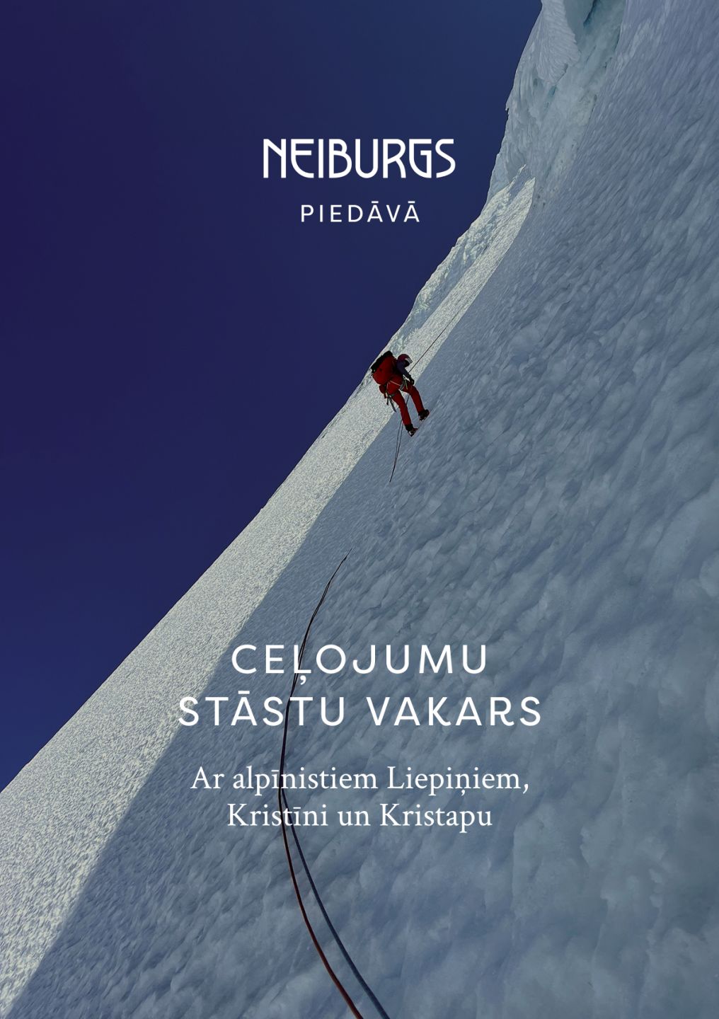NEIBURGS aicina uz ceļojumu stāstu vakaru ar alpīnistiem Kristīni un Kristapu Liepiņiem – pāri, kas jau gandrīz piecpadsmit gadus kopā kāpj kalnos visā pasaulē! Viņu kontā ir astoņas augstkalnu ekspedīcijas Dienvidamerikā vien – pa Andu kalniem Čīlē, Argentīnā un Peru.