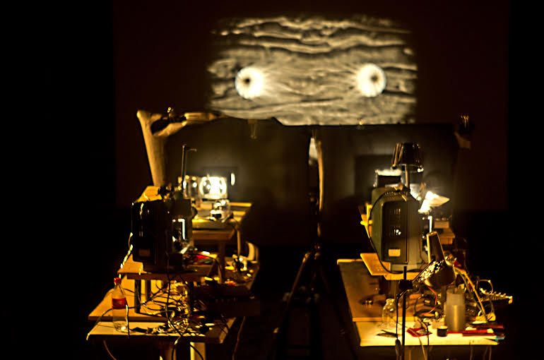 Divu x 16 mm projektoru performance ar skaņu un gaismu