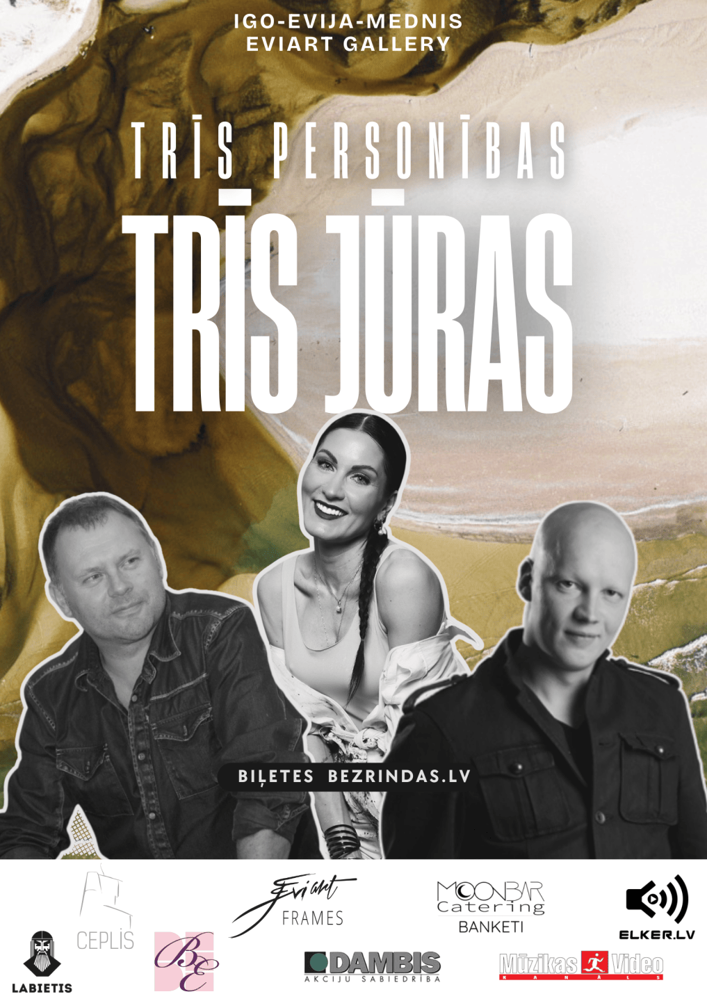 IGO–EVIJA–MEDNIS “TRĪS PERSONĪBAS, TRĪS JŪRAS” ir unikāls mākslas un mūzikas notikums EVIART Gallery, kurā satiekas glezniecība, fotogrāfija, grafika, keramika un skaņa. Trīs nedēļu izstādē apvienojas mākslinieces EVIJAS gleznu jūras motīvi, Jāņa Medņa fotoprojekta Lībiešu krasta fiksācijas un IGO keramikas darbi, grafikas un muzikāla performance.