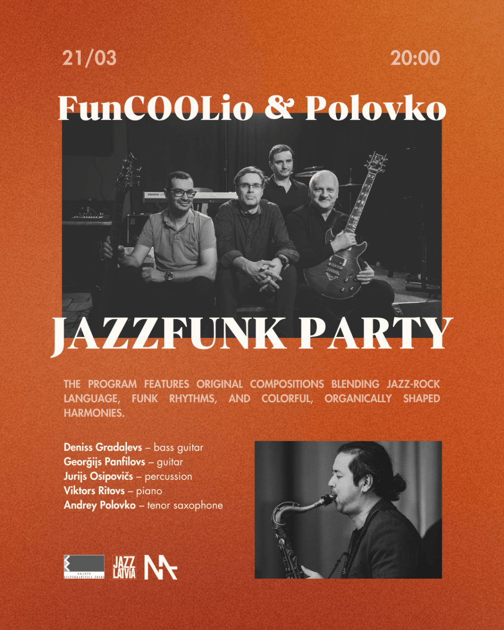 21. martā MASA džeza klubā skanēs enerģiska džeza un fanka programma Baltic Fusion stilā. Uz skatuves muzicēs instrumentālās mūzikas grupa FunCOOLio, kurai šajā vakarā pievienosies saksofonists Andrejs Polovko.