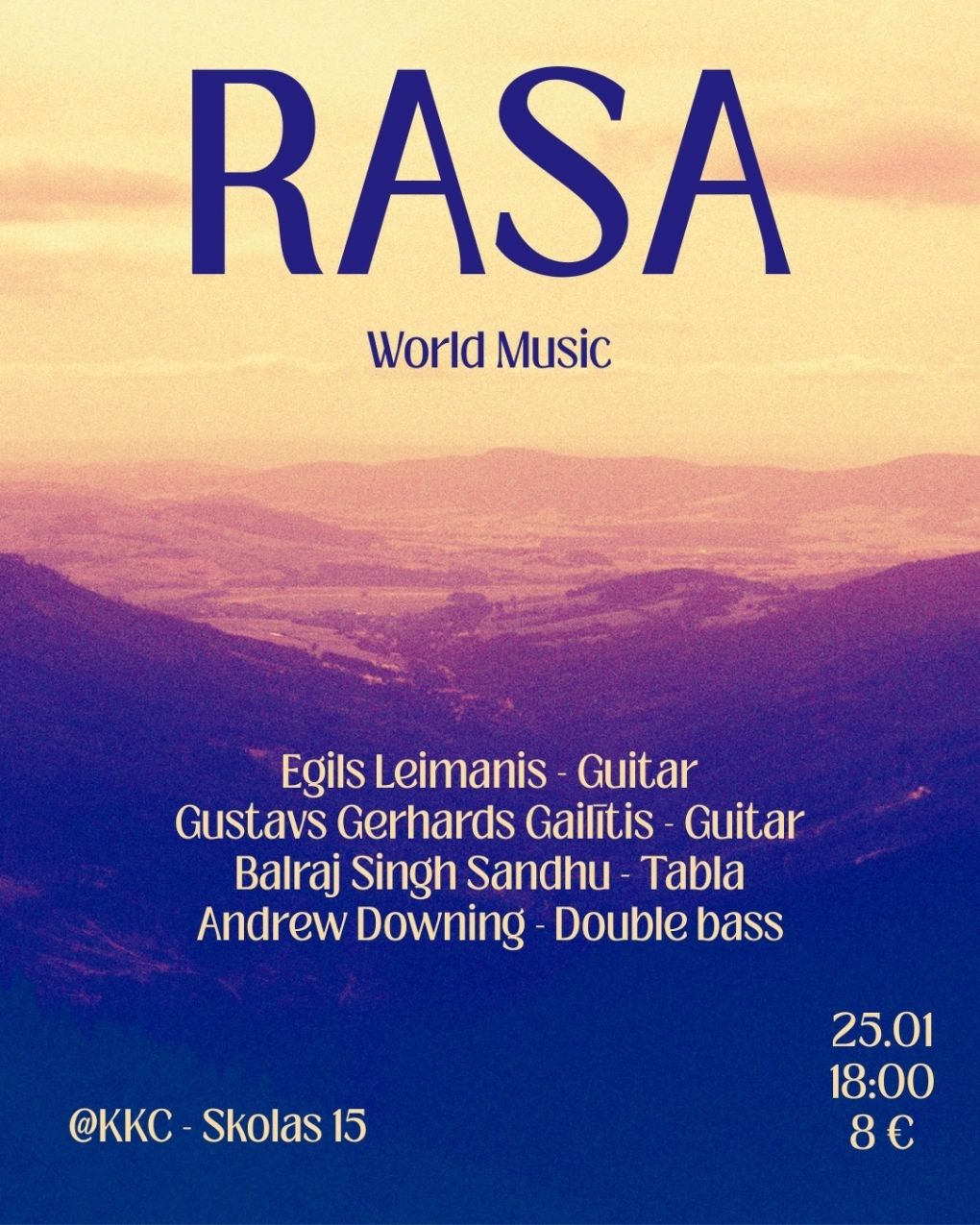 Rasa ir instrumentālās mūzikas sastāvs, kas apvieno austrumu un rietumu mūzikas kvalitāti. Koncertā būs iespēja dzirdēt oriģinālkompozīcijas, kurās dzirdama austrumu un rietumu mūzikas mijiedarbība, kuru raksturo cikliskums un improvizācijas brīvība! Šoreiz Rasa pievienosies lielisks mūziķis Andrew Downing!