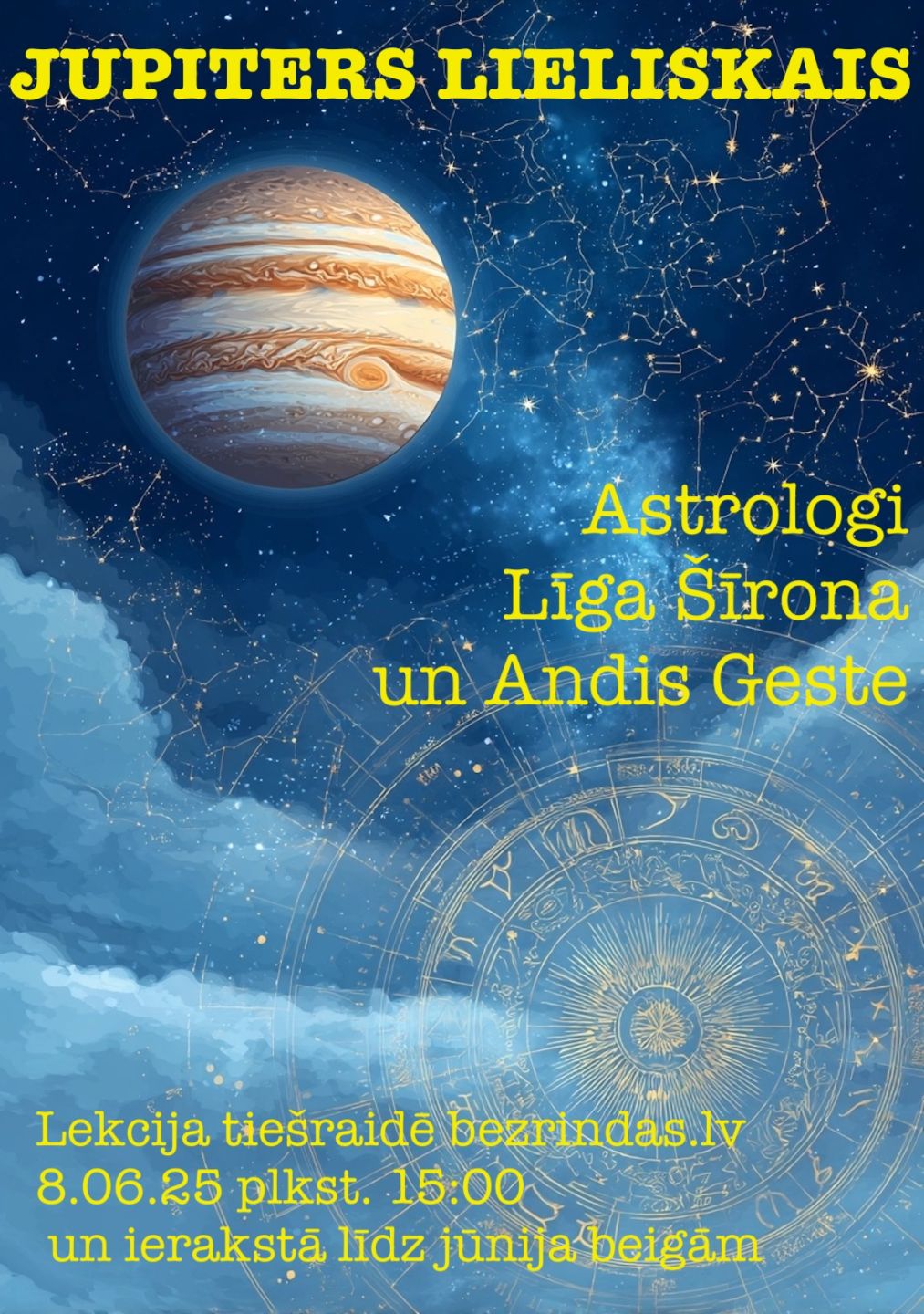 2025.gada 10.jūnijā Jupitera ieies Vēža zīmē un uz vairāk kā gadu būs vienā no labākajām pozīcijām Zodiakā. Kam pievērst uzmanību, kam veltīt savu laiku un enerģiju, kā dziedināties šī Jupitera gada laikā - par to astrologi Līga Šīrona un Andis Geste 8.jūnijā lekcijas tiešraidē vai ierakstā pēc tam.