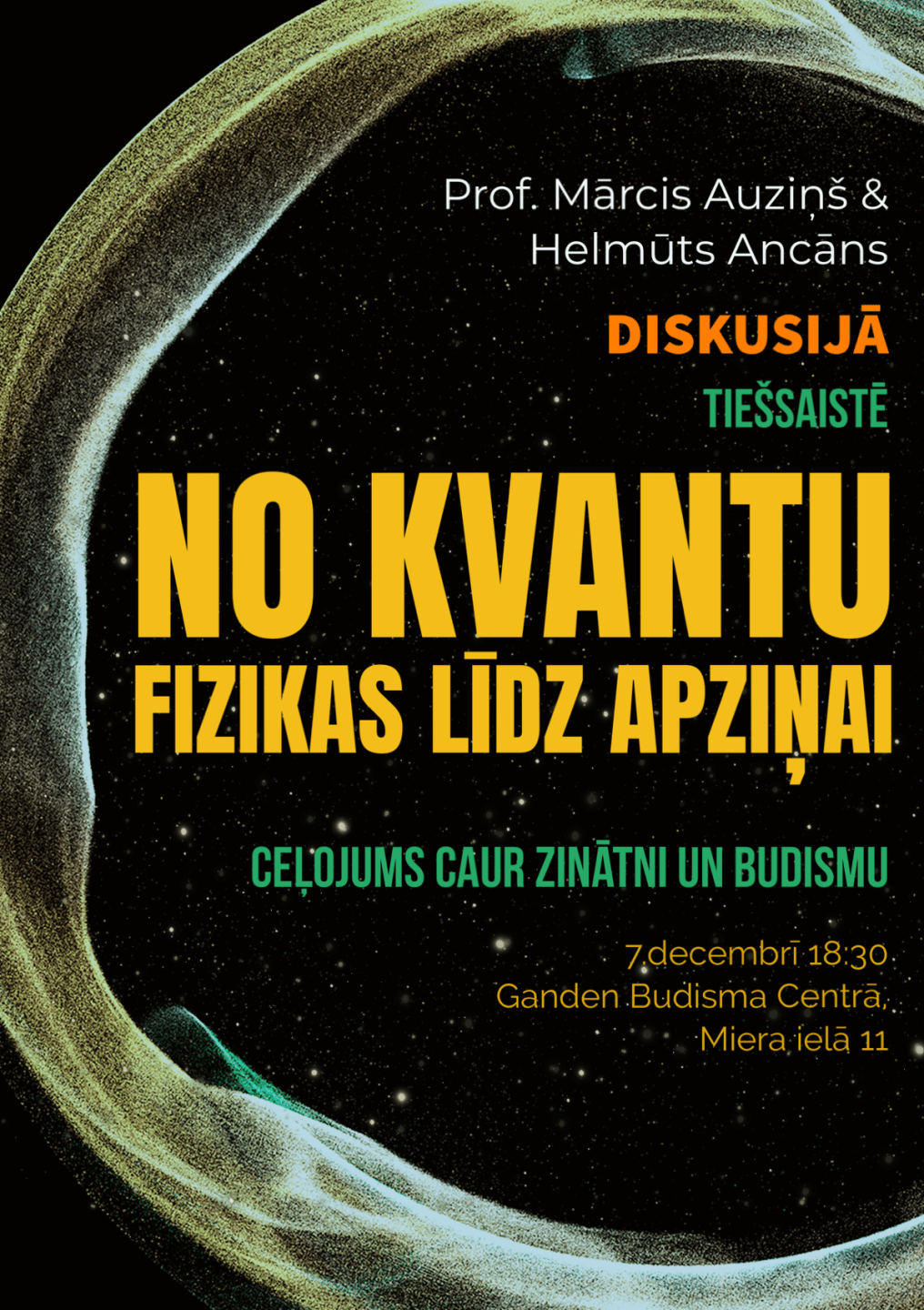 Aicinām pievienoties aizraujošai divu fiziķu un pieredzējušu meditētāju diskusijai tiešaistē “No kvantu fizikas līdz apziņai. Ceļojums caur zinātni un budismu”, kur prof. Mārcis Auziņš un Helmūts Ancāns dalīsies savās zināšanās un pieredzē par tādiem jautājumiem kā: