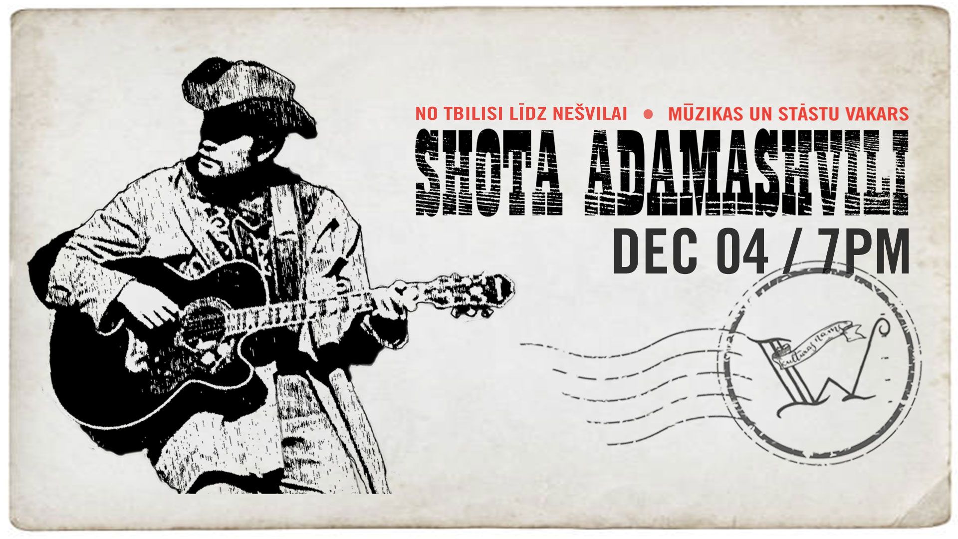 Kultūras nams "Wiktorija" un Šota Adamašvii ielūdz jūs uz mūzikas un stāstu vakaru "No TBILISI līdz NEŠVILAI" , kurā Šota ne vien muzicēs, bet arī izstāstīs jums kādu nupat jau neaizmirstamu atgadījumu iz savas dzīves!
