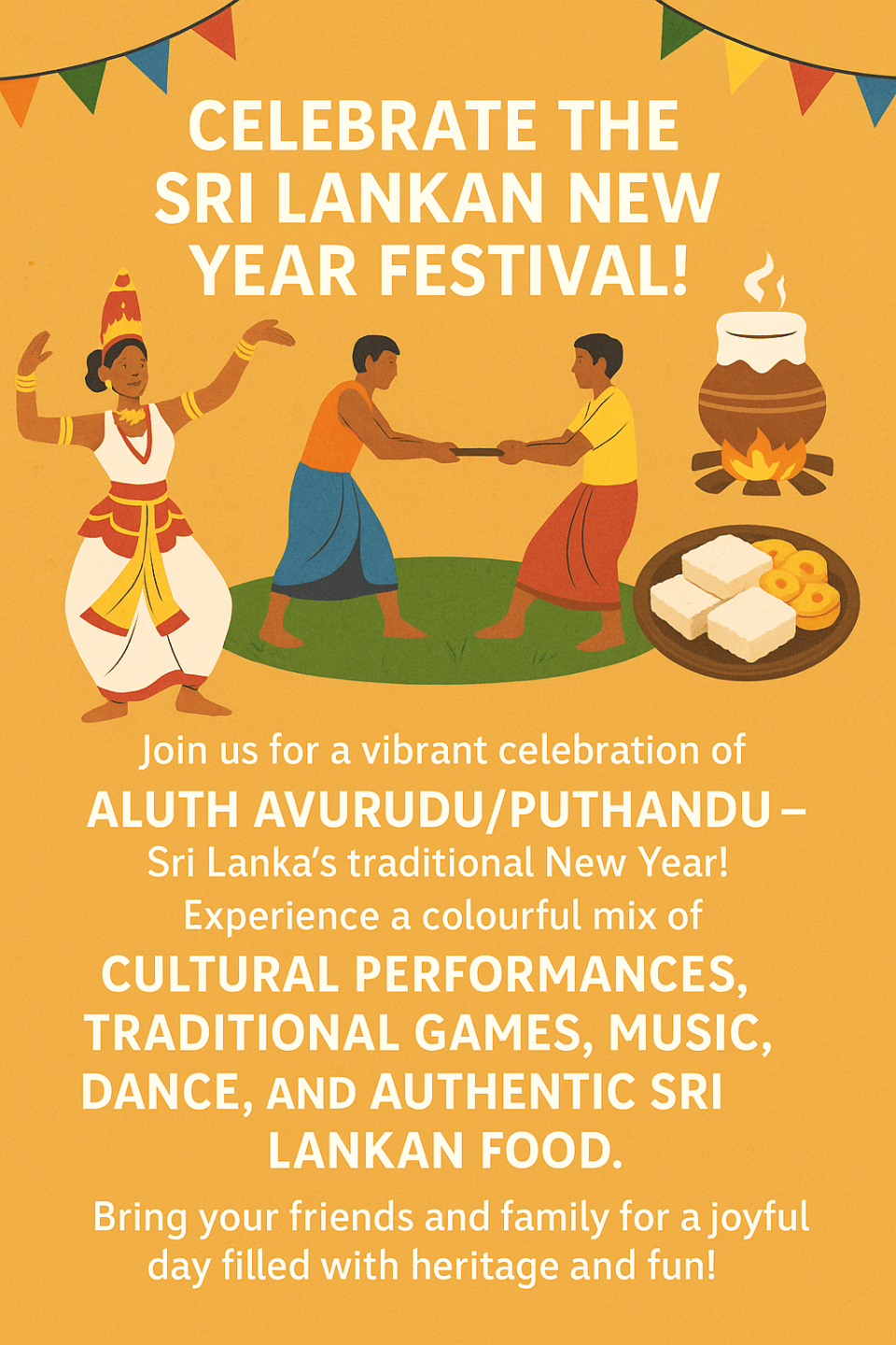 Join us for a vibrant celebration of Aluth Avurudu/Puthandu – Sri Lanka’s traditional New Year! Experience a colourful mix of cultural performances, traditional games, music, dance, and authentic Sri Lankan food. Bring your friends and family for a joyful day filled with heritage and fun!