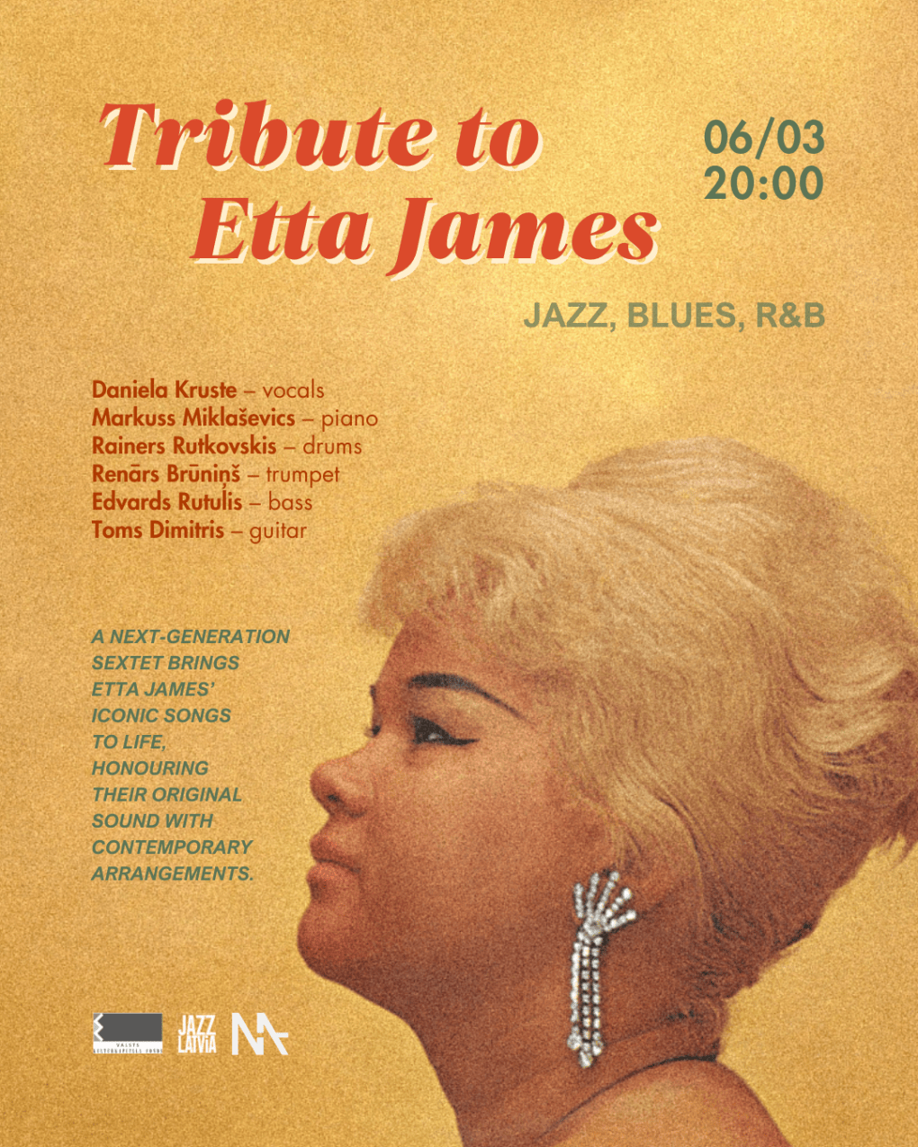 Šajā vakarā jaunās paaudzes sekstets atdzīvinās Ettas Džeimsas ikoniskās dziesmas, saglabājot to oriģinālo skanējumu, pievienojot mūsdienīgas aranžijas.