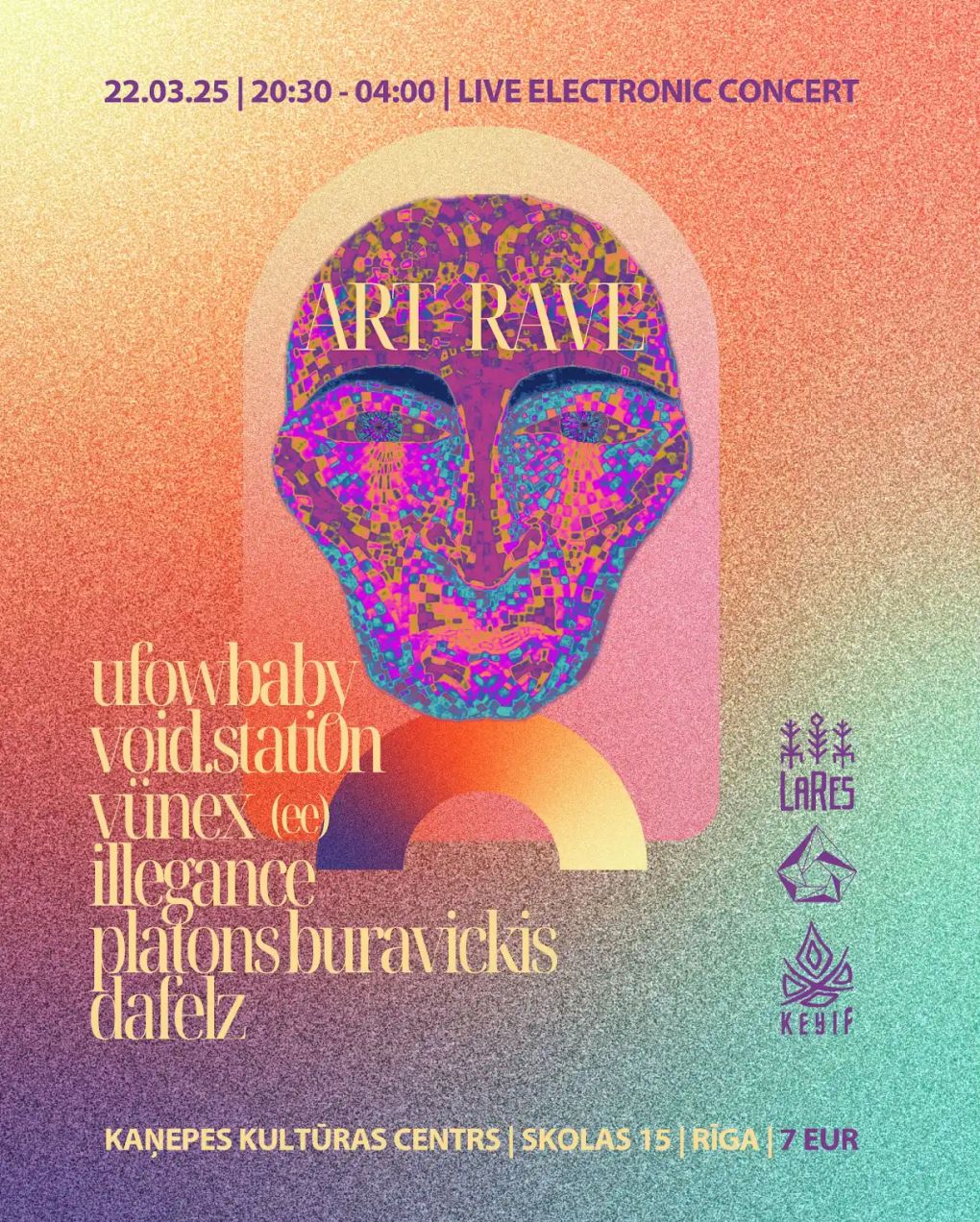 Šajā vakarā Kaņepes Kultūras centrā skanēs oriģināli komponēti skaņdarbi, kas izaicina robežas starp koncertu un deju pieredzi. Aizmirsti ierasto – Art Rave ir ceļojums caur hipnotiskiem ritmiem, eksperimentālām skaņu ainavām un dzīvu sinerģiju starp māksliniekiem un klausītājiem.