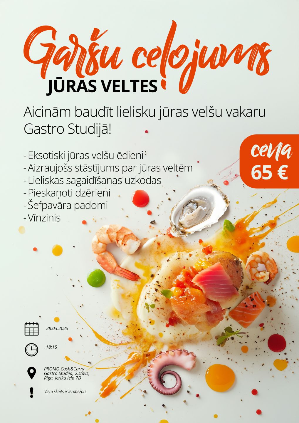 Sagaidīsim Jūs ar gardām uzkodām, eksotiskiem un gardiem jūras velšu ēdieniem, kā arī pieskaņotiem dzērieniem. Pasākumu vadīs šefpavārs Kristaps Jokmanis un Arsēnijs Haitins, iepazīstinot Jūs ar aizraujošiem faktiem par jūras veltēm un to pagatvošanu. Vakaru papildinās vīnzinis, kurš pastāstīs par pieskaņotajiem dzērieniem.