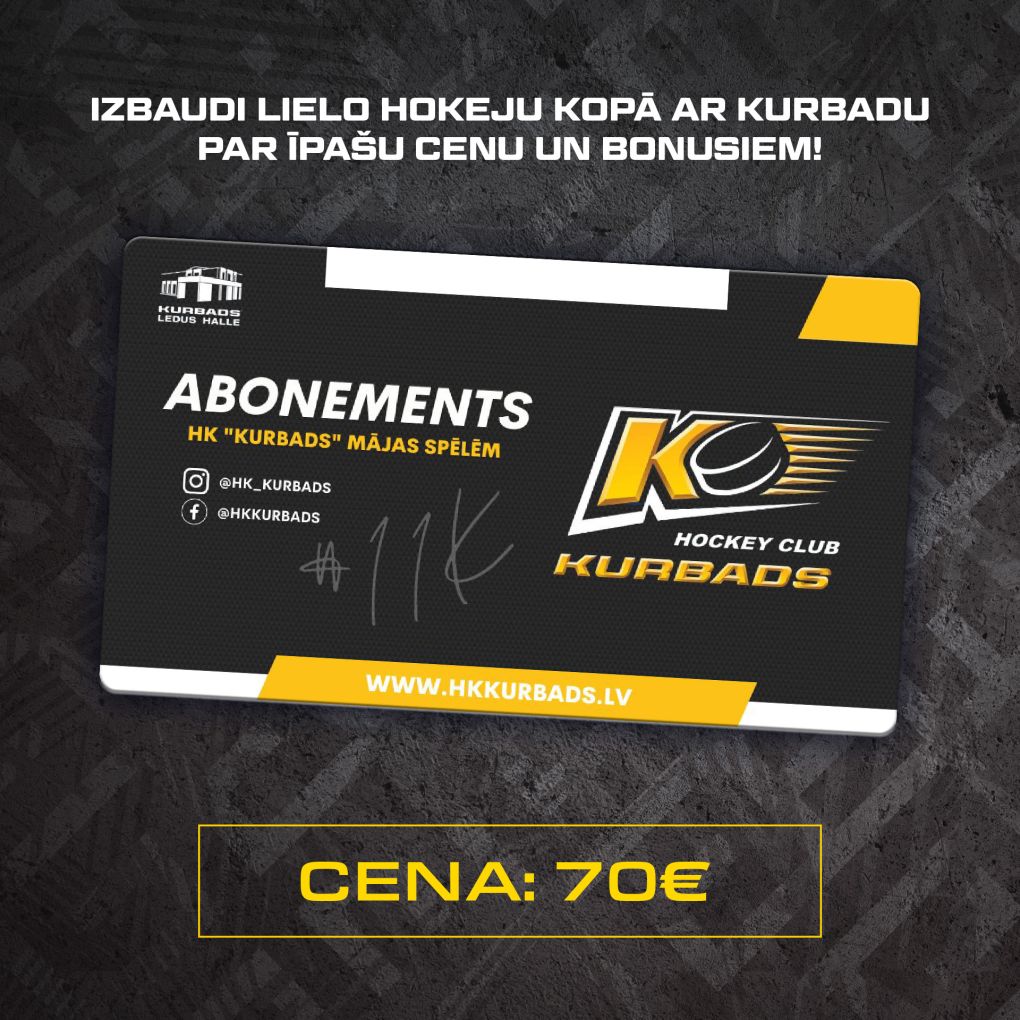 Abonements ir derīgs visām HK Kurbads (OPTIBET HOKEJA LĪGAS) mājas spēlēm Kurbads ledus hallē un tā vērtība ir vairāk nekā 110 EUR.