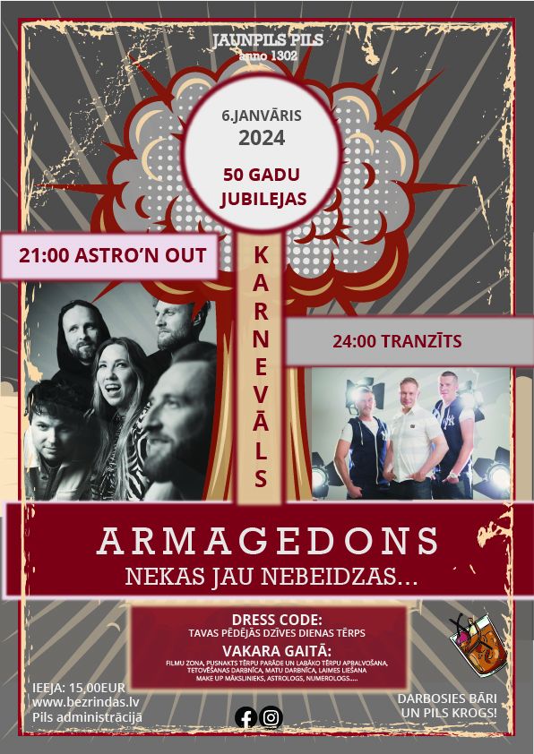 Grupa "ASTRO'N'OUT" ar savām labākajām dziesmām radīs īpašu jubilejas karnevāla noskaņu un pēc pusnakts notiks jaunās pasaules "dzimšana" kopā ar grupu "TRANZĪTS".
