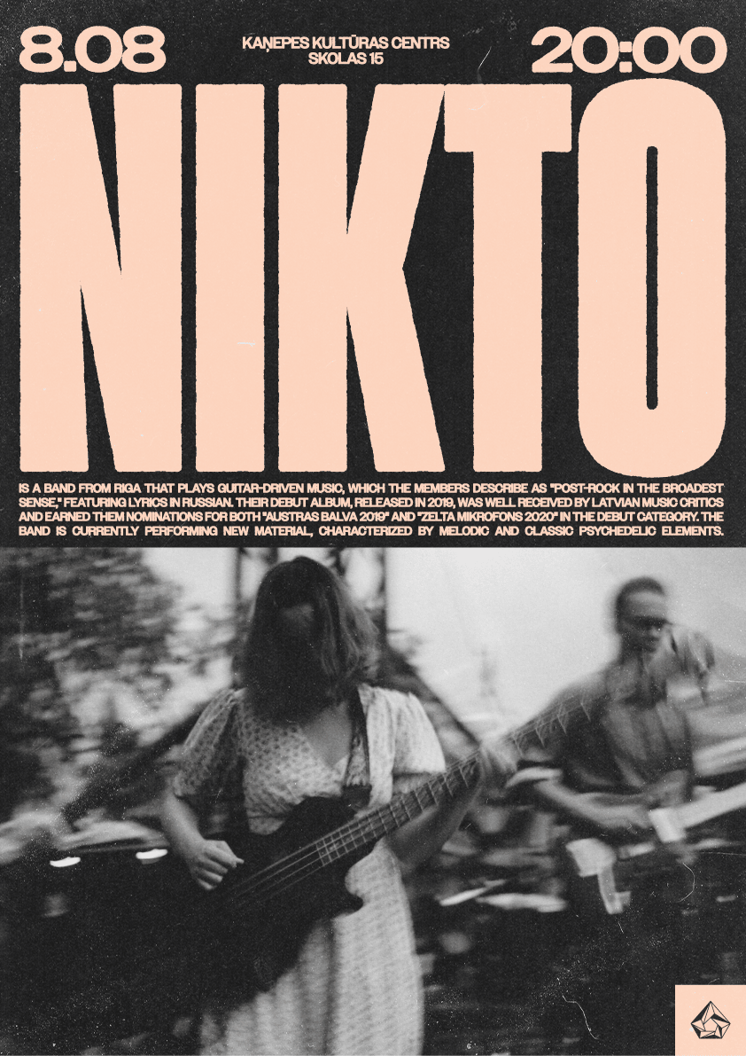 "Nikto" is a band from Riga that plays guitar-driven music, which the members describe as "post-rock in the broadest sense," featuring lyrics in Russian. Their debut album, released in 2019, was well received by Latvian music critics and earned them nominations for both "Austras balva 2019" and "Zelta mikrofons 2020" in the Debut category. The band is currently performing new material, characterized by melodic and classic psychedelic elements.