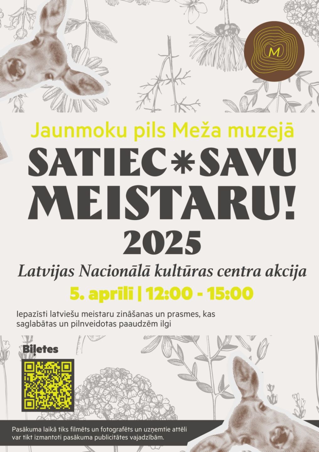 Šogad “Satiec savu meistaru!” notiks jau 17. reizi un ir lieliska iespēja iepazīt latviešu meistaru zināšanas un prasmes, kas saglabātas un pilnveidotas paaudzēm ilgi. Akcija norisināsies trīs nedēļas nogales: Kurzemē un Zemgalē 5. un 6. aprīlī, Vidzemē un Sēlijā 12. un 13. aprīlī, Rīgā un Latgalē 26. un 27. aprīlī. Tā būtība – vēstīt plašākai sabiedrībai par zināšanām un prasmēm, kas saglabātas un pārmantotas no paaudzes paaudzē; veicināt interesi, izpratni un sabiedrības līdzdalību Latvijas nemateriālā kultūras mantojuma saglabāšanā.